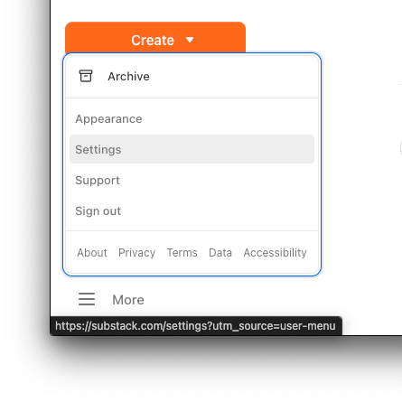 Notice the “hamburger” menu in the bottom left and the word More. Tap that and go to Settings. (Or make sure you’re logged in and go to substack.com/settings.)