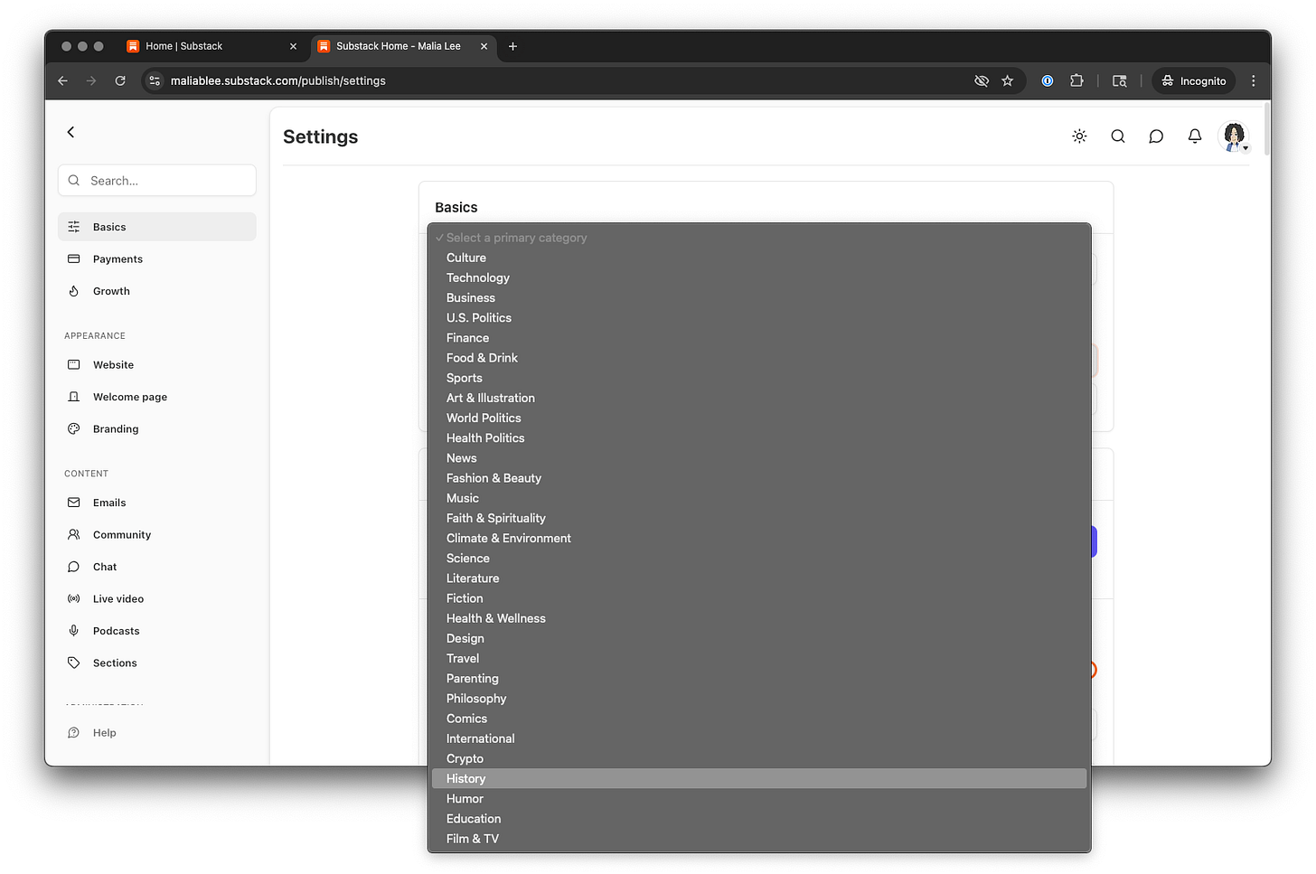 Here’s how to specify History as an interest category for your publication. This affects all posts under this publication. The only way to specify interest categories in greater detail is by using tags in individual posts. These appear to be used by the algorithm to further refine interests, but that is not documented.